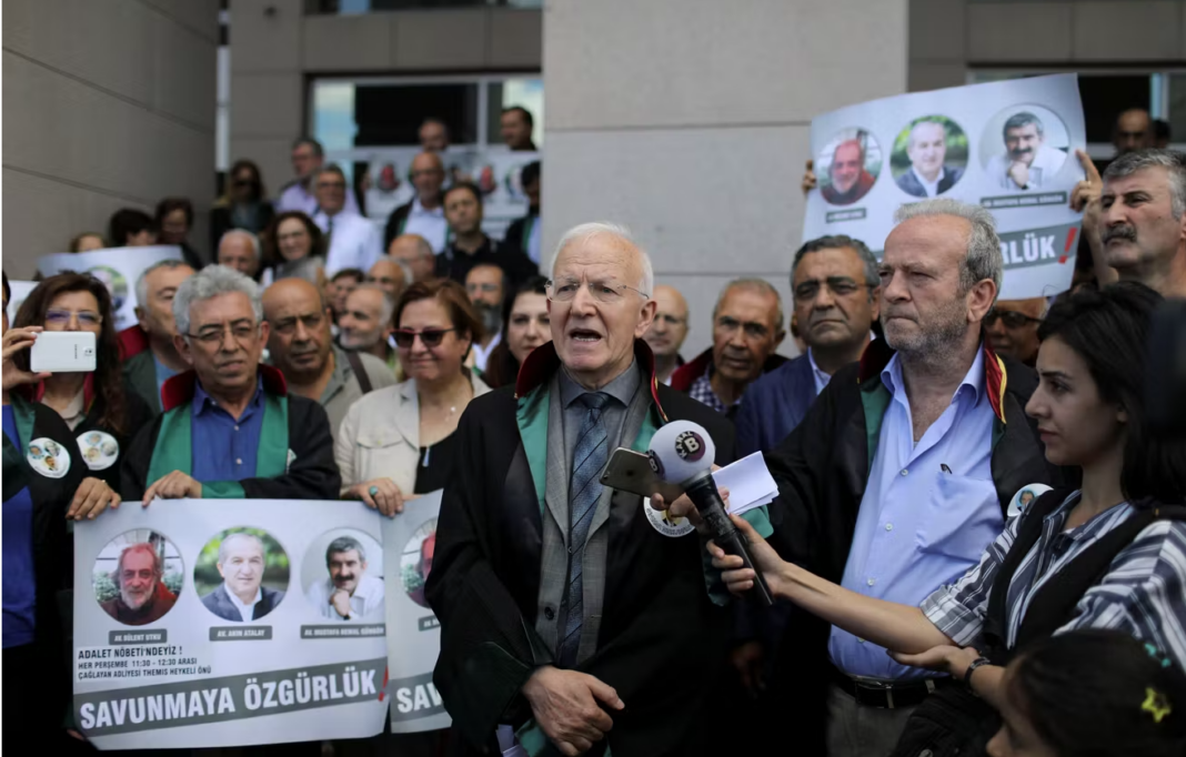 Ibrahim Kaboglu, présent dans l’immense salle du tribunal du centre pénitentiaire de Silivri, en lointaine banlieue d’Istanbul, était entouré, comme depuis le début des audiences lundi, d’une soixantaine de bâtonniers et d’avocats venus de toute l’Europe. Dans sa dernière plaidoirie, commencée à 11 heures, ce célèbre constitutionnaliste âgé de 75 ans, professeur de droit et ancien député, a tenu à rappeler de manière très solennelle que « si les exigences d’un procès équitable étaient respectées, la Turquie ne figurerait pas parmi les pays où le droit à un procès équitable est le plus fréquemment violé ».
