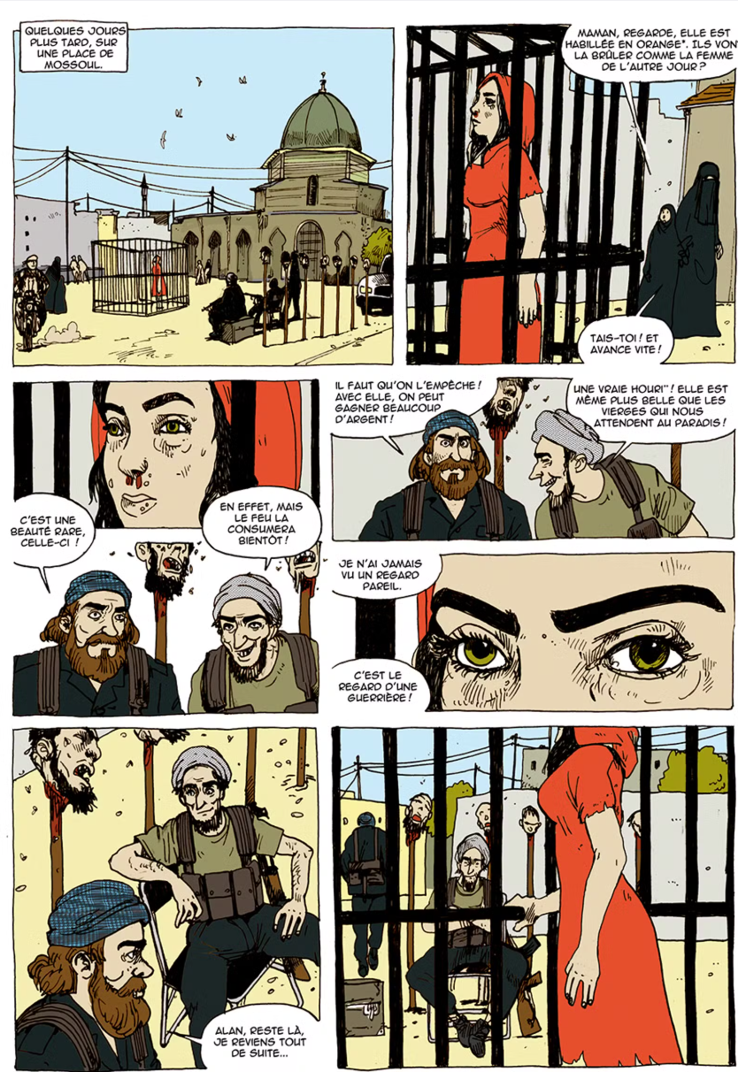 Deux planches d’une BD, La Liberté dans le sang (Marabulles), sortie en 2024, signée Christophe Girard et dont Kudret a écrit le scénario, sont posées sur la table. L’une d’elles représente l’héroïne, Rojîn, une Franco-Kurde réduite en esclavage en Syrie par l’Etat islamique, en train de sortir de la tristement célèbre prison nᵒ 5 de Diyarbakir. L’autre la montre seule, armée de son fusil.