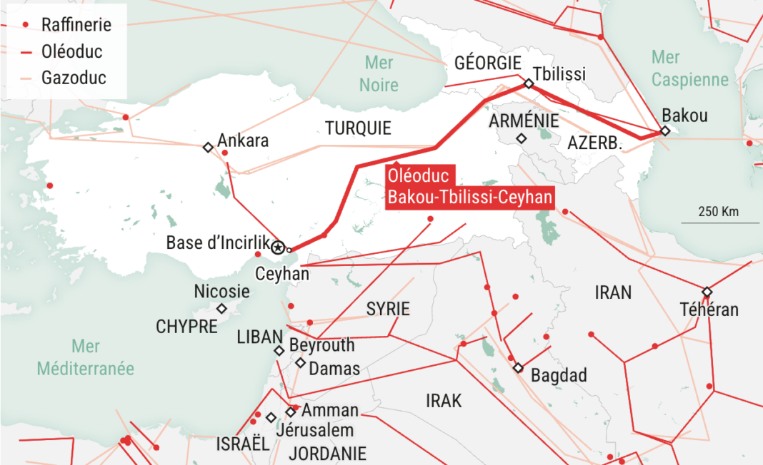 L’oléoduc Bakou-Tbilissi-Ceyhan est d’autant plus sensible aux yeux de la République islamique d’Iran qu’il va à l’encontre de ses intérêts géopolitiques. Poussé par les États-Unis d’Amérique à la fin des années 1990, le mégaprojet de 4 milliards de dollars, bâti par un consortium de compagnies pétrolières internationales, visait au départ à concurrencer le gaz russe en promouvant les hydrocarbures des ex-républiques soviétiques du Caucase – Azerbaïdjan et Géorgie –, désormais indépendantes. Son tracé évite soigneusement l’Arménie, alors en guerre avec Bakou sur le Haut-Karabakh et liée à la Russie par des accords militaires, ainsi que l’Iran, ennemi de Washington et partenaire de Moscou, malgré ses énormes richesses en gaz et en pétrole. Mais pas la Turquie, pierre angulaire de la stratégie énergétique américaine dans la région. Et alliée de l’Azerbaïdjan, un État turcophone et musulman, comme elle.